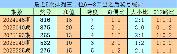 1、最近两期排列三十位号码开出号码分别为6和8,历史上十位号码连续两期同时出现号码6和8的奖号共开出81期。最近五次下期开出号码为:816、875、265、532、276;