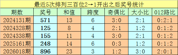 1、排列三最近两期百位号码分别开出2和1,历史上百位号码连续两期分别开出2和1的奖号出现了66期。前五期开出之后其下期奖号分别为:571、125、155、248、896;