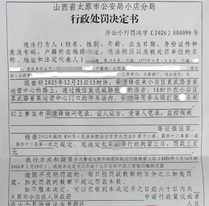 行政处罚决定书显示,荣某锋2025年12月21日下午4点,在小店区真武路晋泉运营中心门口的停车场,用拳头殴打张先生头部。