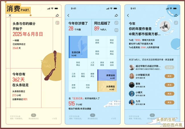 除“作者来信”这一重磅板块外,年鉴其他板块同样亮点纷呈。“精选年鉴”板块汇编全年重磅报道,从DeepSeek大模型爆火到伊以冲突升级,一篇篇深度好文彰显“头条精选”的优质内容品相,让用户在回顾中感受个体与世界的深度连接。用户@直爽张姐感慨:“原来我的每一次阅读都被记得”“从今日头条里关心世界大事”。