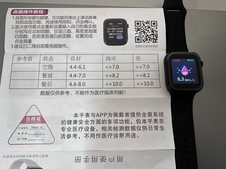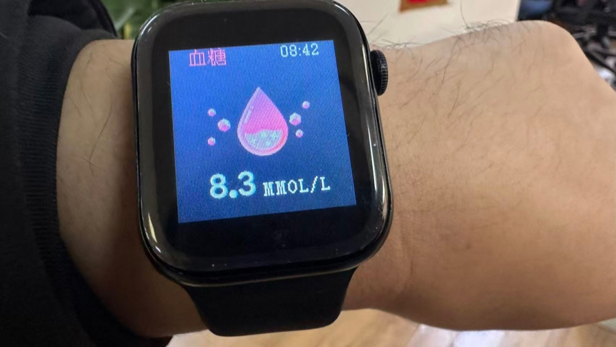 记者对照血糖操作教程进行了实际测试,首先佩戴在记者本人手腕上,选择监测“餐后”血糖值,在手表主屏幕闪烁约十秒后,跳出一个血糖值8.3mmol/L;又将手表佩戴在一位同事手上,跳出的血糖值为9.2mmol/L。然而,当记者再次将手表佩戴到自己手上时,跳出的数值又变成了7.7mmol/L,同事第二次测出的数值变成9.7……每一次佩戴,都会跳出不同的数值。