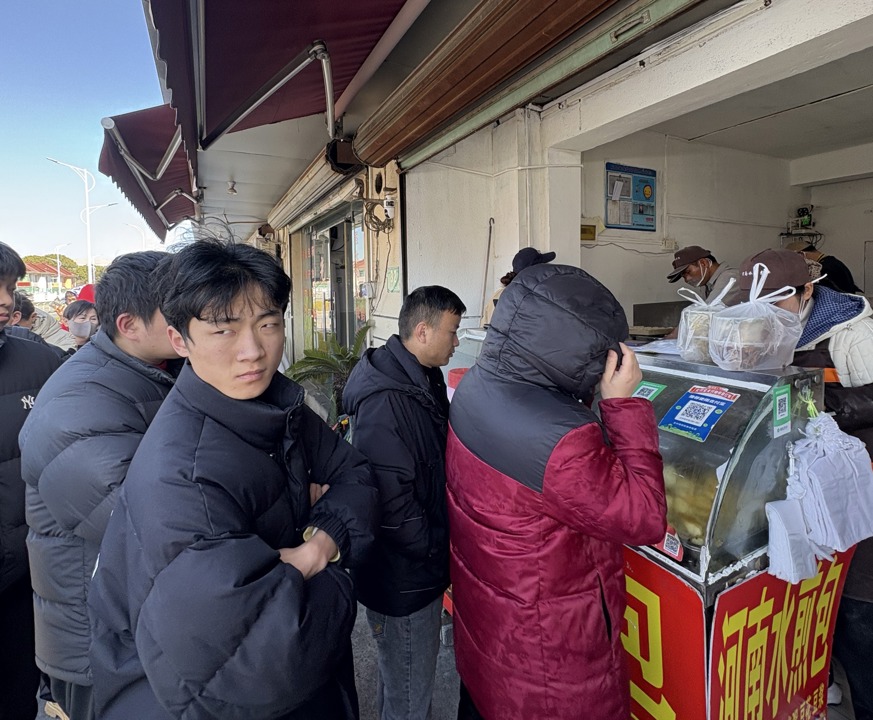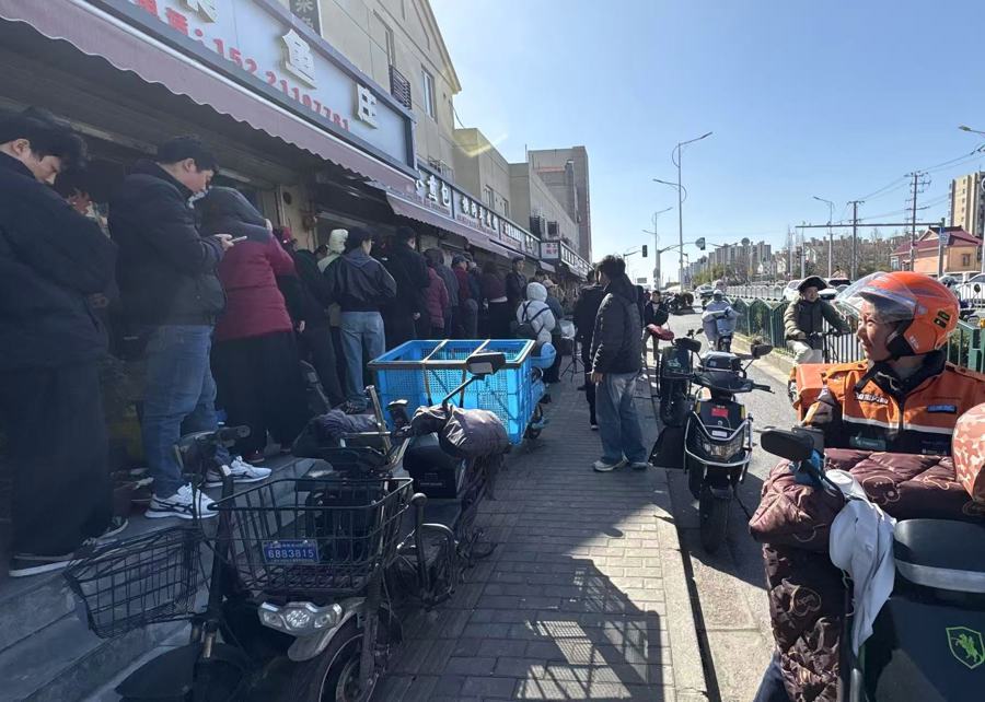 3月10日,水煎包店门前列队的东说念主群。杨书源 摄