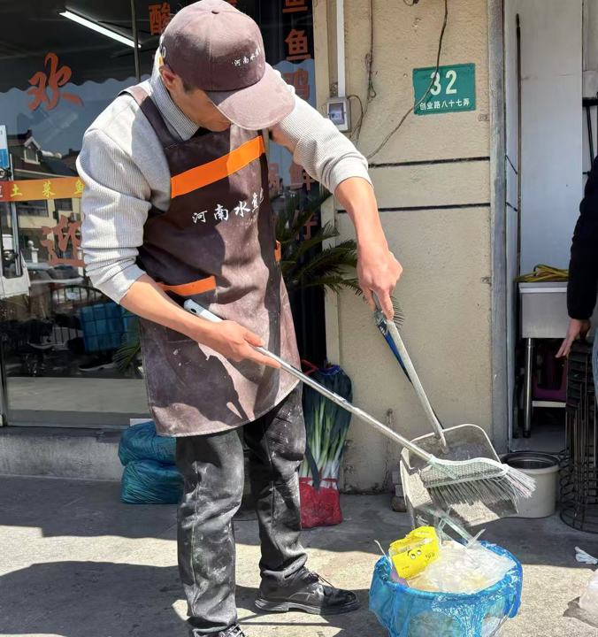 每天中午闭店后,王凯阳非论多累,也要打扫店门前锋生。 杨书源 摄