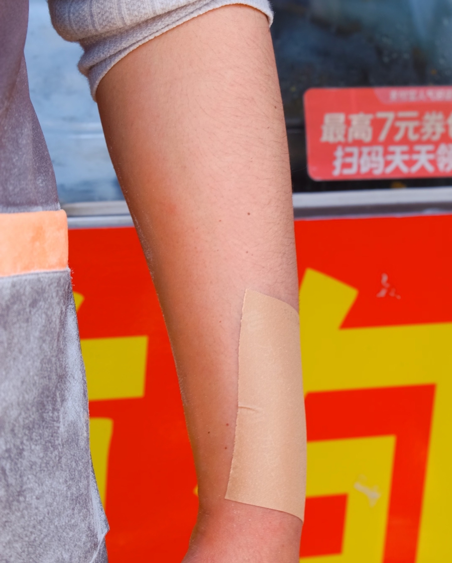 因揉面、包包子的使命量增多,伙计们手臂都出现了红肿,并贴上了膏药。 瞿王烨 摄
