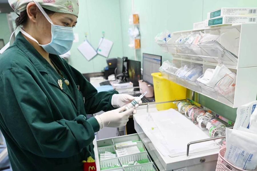 上海市老年医学中心内镜中心的麻醉科大夫为患者准备麻醉药剂