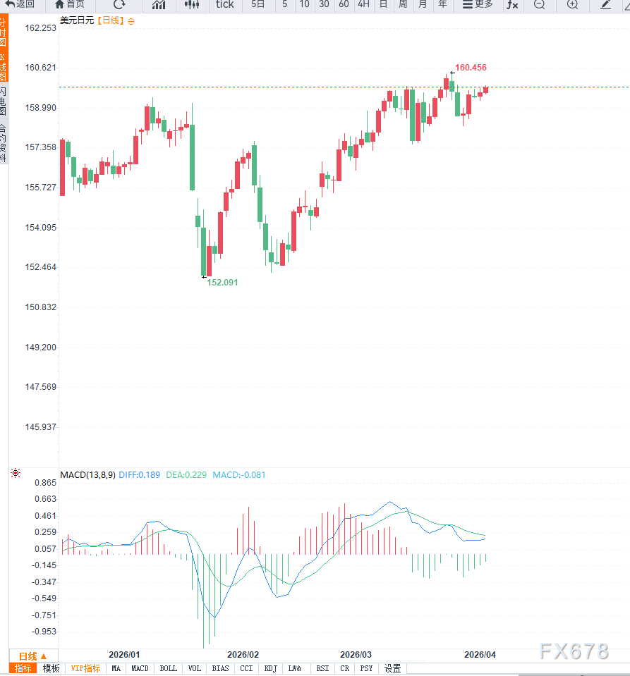从本领面来看,日线级别上,USD/JPY合座仍处于上升趋势通谈中,自2月低点以来捏续抬升,高点与低点渐渐上移,趋势结构完竣。现时价钱靠拢前期高点区域,造成光显本领压制。关节阻力位位于160.00-160.50区间,若有用打破,将绽开进一步上行空间;下方复古位位于158.00,进一步复古在156.50。动能缠绵闪现多头仍占优,但高潮节拍有所放缓。