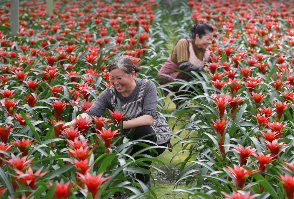 在湖北荆门钟祥市柴湖镇,4000余亩花草产业园连片铺展,一个个轨范化智能温室大棚参差有致,在春日暖阳下特地详确。步入棚内,红掌、凤梨等盆栽勃勃期望,村民穿梭其间,修剪枝桠、全心管护;园区外,工东谈主们快速分拣、打包,将花草销往天下各地。