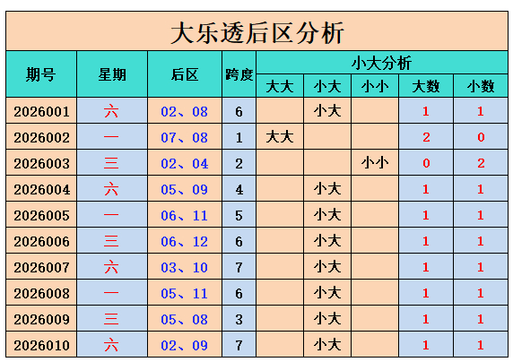 最近10期后区大小比为10:10,最近10期后区大大组合开出1期,小大组合开出8期,小小组合开出1期。上期开出小大组合,本期看好小小组合出现。