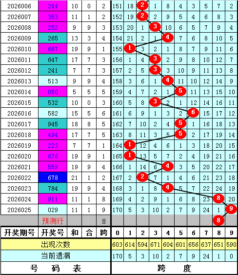 福彩3D第2026025期最大跨度开出9,近期最大跨度波动较大,本期预计最大跨度在5-9区段开出,最大跨度参考6789,一码跨度参考8。