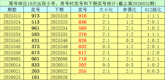 在尾号球前10次开出小 号、奇号类型之后,其下期分别开出奖号:918、836、583、276、826、032、617、718、202、255,其中号码奇偶比为3:7,大小比为7:3,012路比为4:1:5。
