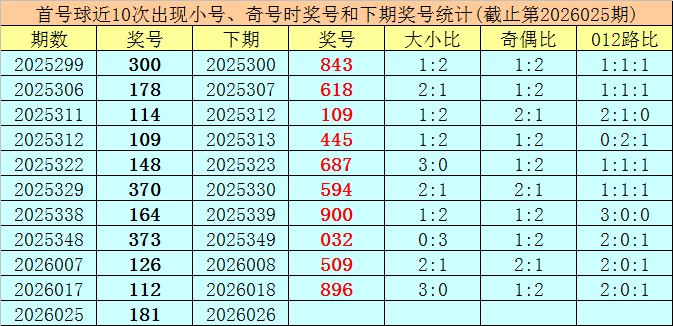 首号球:上期奖号为1,开出小 号、奇号,该位前10次开出小 号、奇号的现象时其奖号分别为:300、178、114、109、148、370、164、373、126、112,其中首号球012路比为3:7:0。